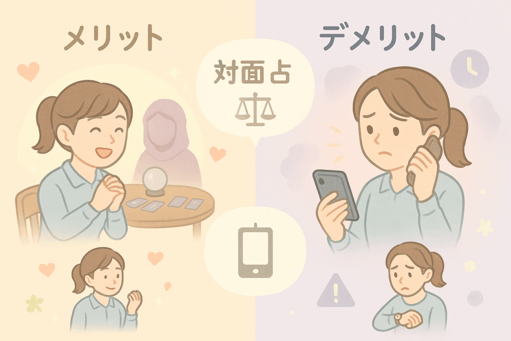 どちらも占い師に直接相談できる方法ですが、スタイルの違いによって得られる安心感や相談しやすさは変わります。