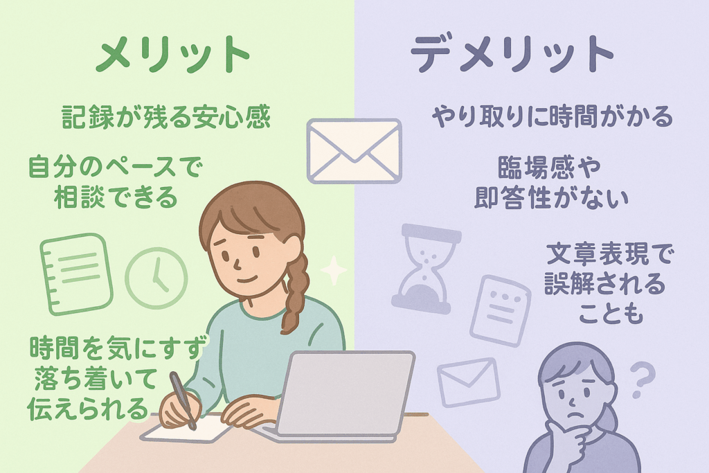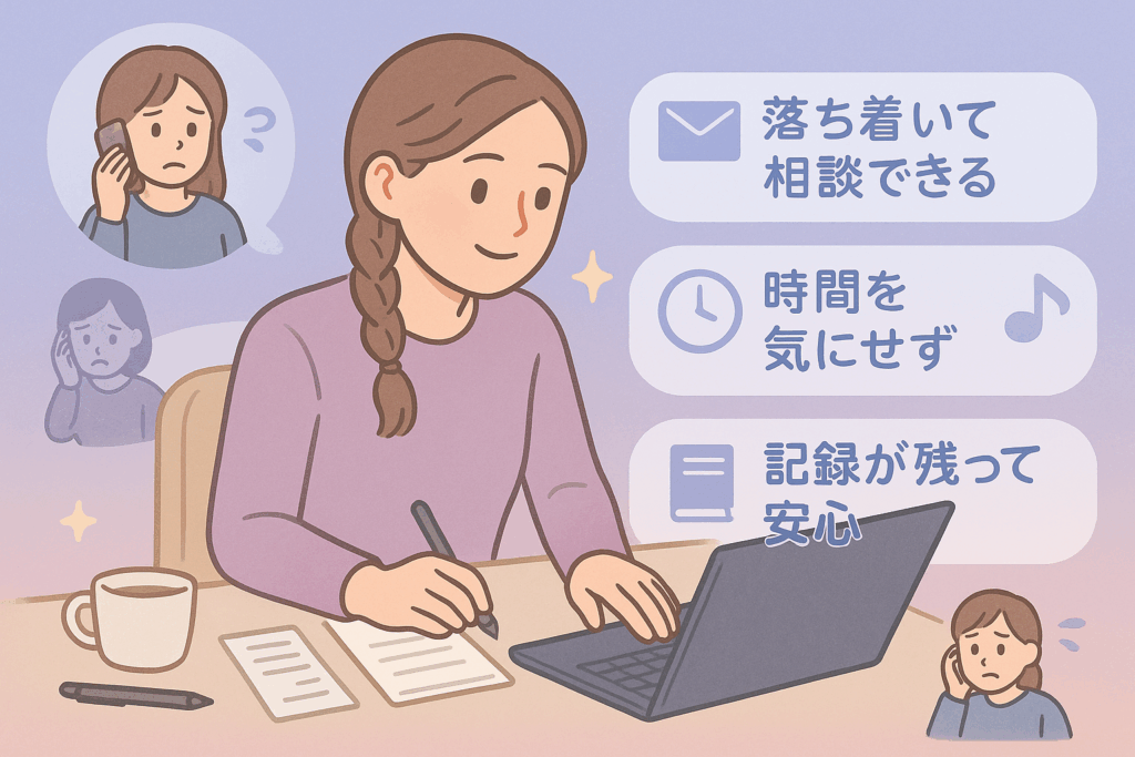 リアルタイムのやり取りではありませんが、文章を通じて落ち着いて相談できるのが特徴です。