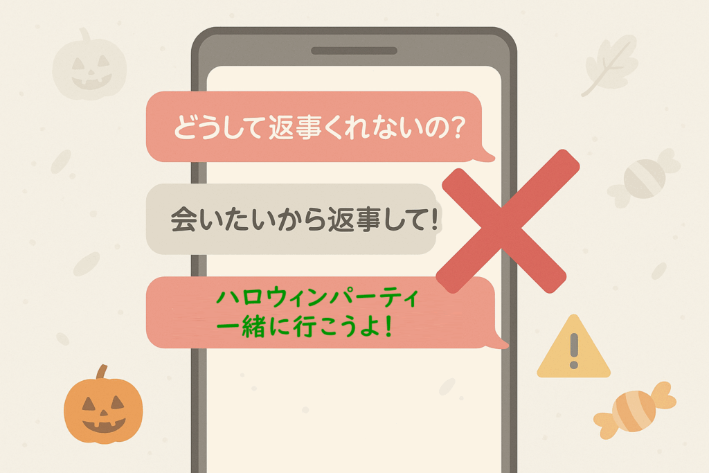 「どうして返事してくれないの?」と問い詰めるよりも、「元気かな?」「街がハロウィンでにぎやかだね」といった、軽い話題の方が安心してやり取りを再開できますよ。