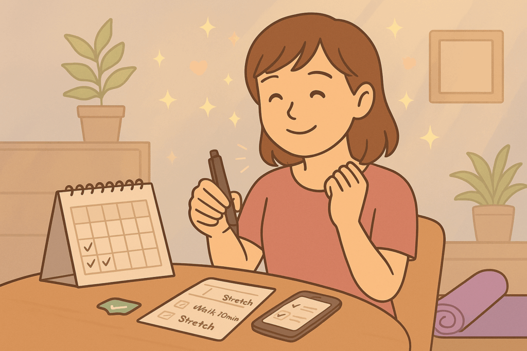 ノートやスマホのメモに「今日は散歩10分」「寝る前にストレッチ3分」と書くだけでもOK。